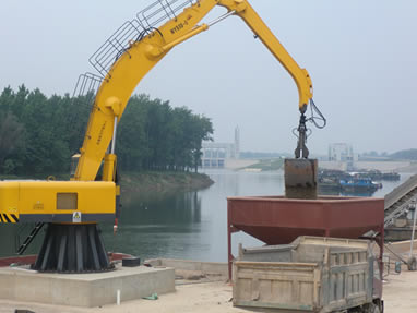 電動液壓固定式抓料機奮戰(zhàn)在碼頭礦山卸船一線